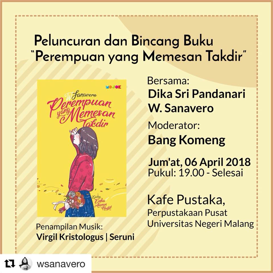 Memesan Takdir karya W. Sanavero diadakan Jum’at, 6 April 2018 di Kafe Pustaka