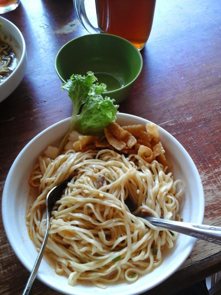 mie ayam Indonesia. Biasanya mie ayam Indonesia memakai kari ayam atau ayam
