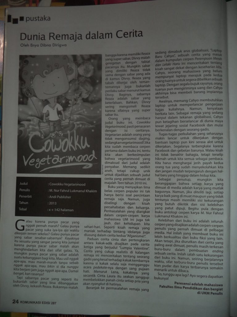 | Resensi “Cowokku Vegetarimood” yang dimuat Komunikasi No. 287 Edisi Juli-Agustus 2013 |