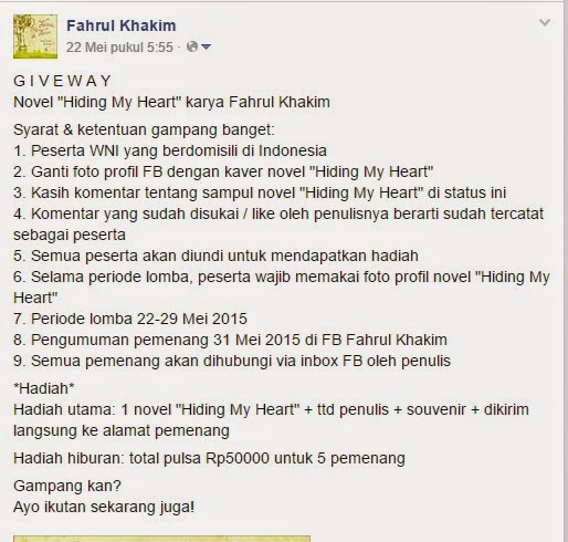 3. Kasih komentar tentang sampul novel “Hiding My Heart” di status Giveway FB Fahrul Khakim