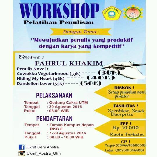 Buat kamu yang ingin tahu bagaimana cara nulis nonfiksi dan fiksi, bisa ikutan workshop ini di Bangkalan, Madura: Minggu, 30 Agustus 2016. Kamu akan dapat ilmu yang bermanfaat, sertifikat, dan snack. Doorprize menarik juga sudah disiapkan untuk kamu yang ikut nanti. Aku akan berbagi tips dan trik menulis yang seru agar kamu bisa menerbitkan karyamu. Kamu juga bisa dapatkan buku-buku saya dengan harga yang lebih terjangkau saat acara berlangsung. Jangan lewatkan acara ini ya?